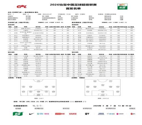 3月7日15點(diǎn)30分,2026賽季中超聯(lián)賽首輪,天津津門(mén)虎對(duì)陣升班馬重慶銅梁龍的比賽在天津泰達(dá)足球場(chǎng)進(jìn)行,目前本場(chǎng)比賽的首發(fā)替補(bǔ)名單已經(jīng)正式出爐!